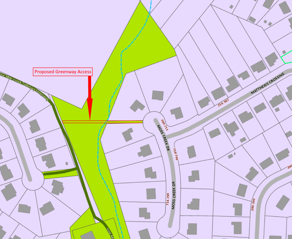 The proposed greenway access sits between 706 and 712 Moss Creek Drive.